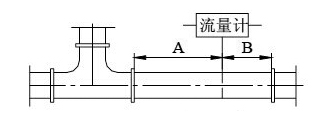 1.流量計上游有90°彎頭 保證流量計的前直管段A≥7D,后直管段B≥3D |